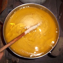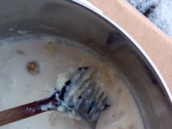 Scolate l’aglio ancora caldo e “pestatelo” con una forchetta. Buttate il latte e rimettere l’aglio pestato nella pentola.